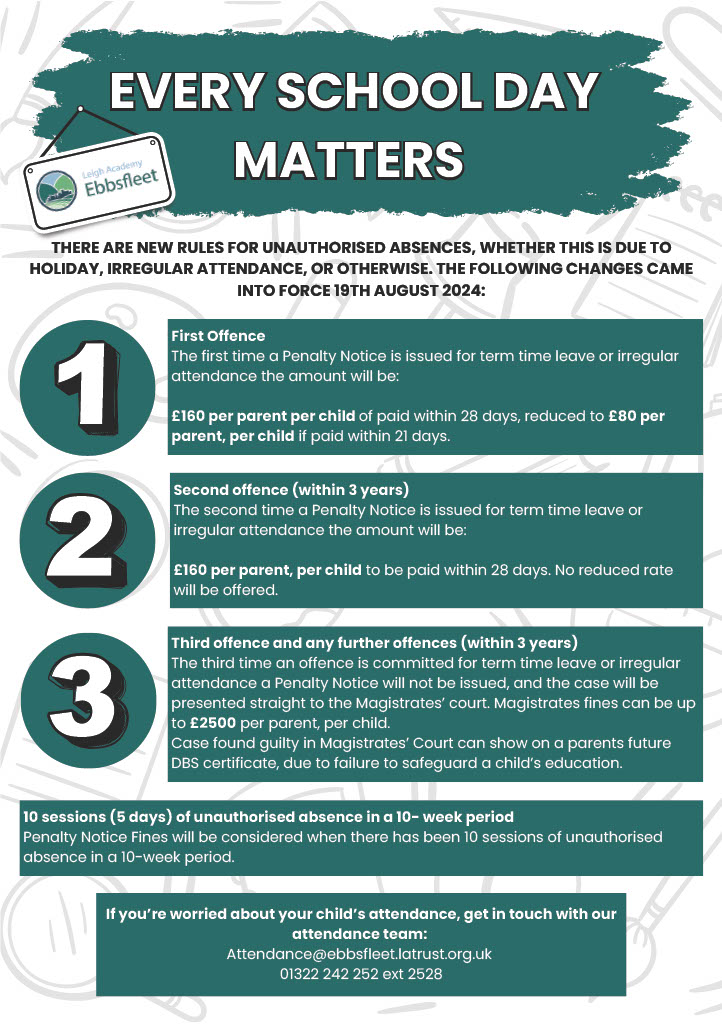 Parents should not arrange holidays during term times as these are NOT permitted at Leigh Academy Ebbsfleet. They will incur a Fixed Penalty Notice fine of £160.00 per parent, per child. In exceptional circumstances should you require a leave of absence this must be submitted in advance in writing to the academy Principal for consideration.