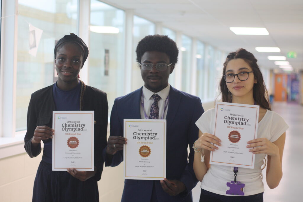 The year 13 chemistry students took part in the UK Chemistry Olympiad this year. This is a chemistry competition run by the Royal Society of Chemistry (RSC) which is designed to challenge and inspire chemistry students and also to develop their critical thinking skills. The following students participated in round one of the 58th annual competition: Enioluwa Olanrewaju, Mitchell Inyang and Aleyna Matnish. The students represented Leigh Academy Ebbsfleet and completed a written test on their contextual knowledge of chemistry in real life. We are pleased to announce that based on their high scores Enioluwa and Aleyna received bronze awards and Mitchell received a gold award. A big congratulations to their hard work!